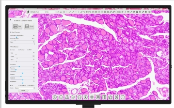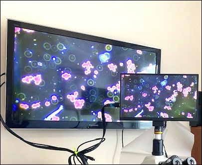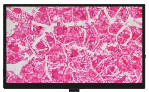 This unit allows the production of still images and video clips from any trinocular microscope either high power compound microscopes or low power stereomicroscopes. It has a good sized screen measuring 13.3 inches in diagonal, but in addition because it has HDMI and USB output ports it can also attach to other even larger screens or computers for image manipulation. It can also WiFi. By all measures this is therefore an excellent teaching tool.